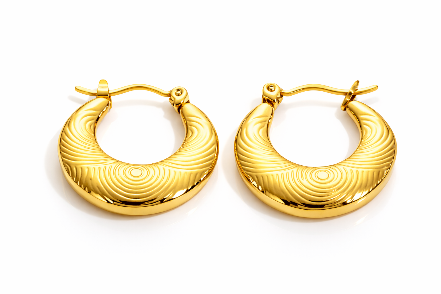 Coppia di orecchini in acciaio dorato con superficie lavorata. Design compatto e deciso, perfetto da giorno e da sera.