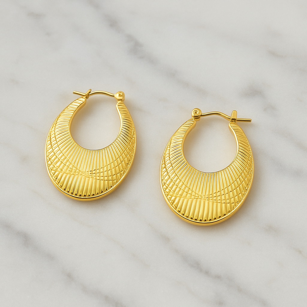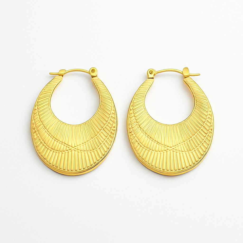 Coppia di orecchini in acciaio dorato con superficie lavorata. Design compatto e deciso, perfetto da giorno e da sera.